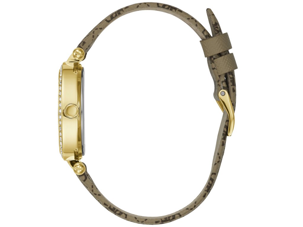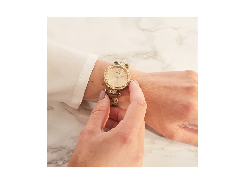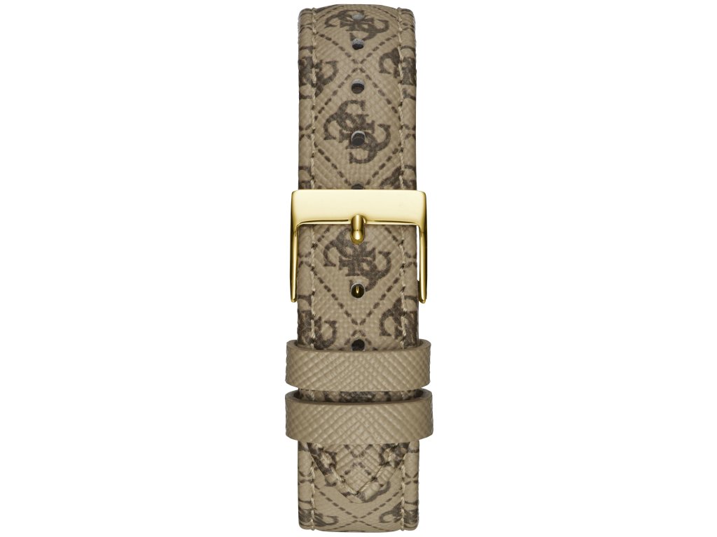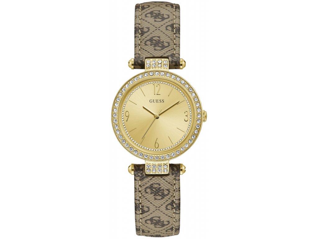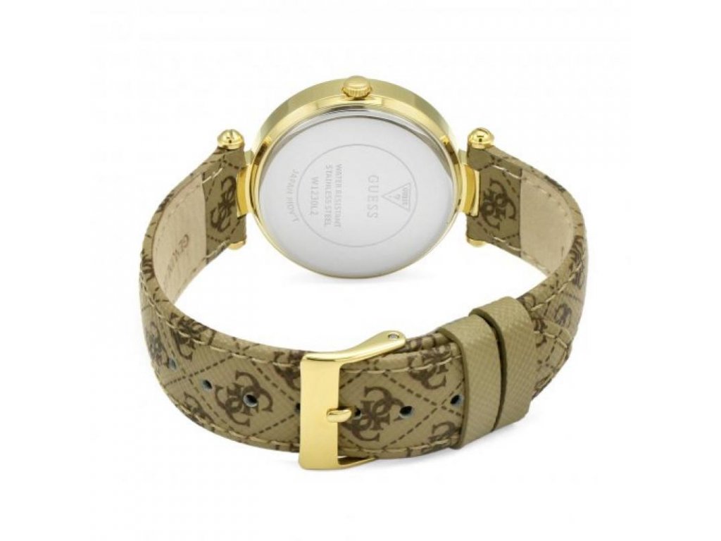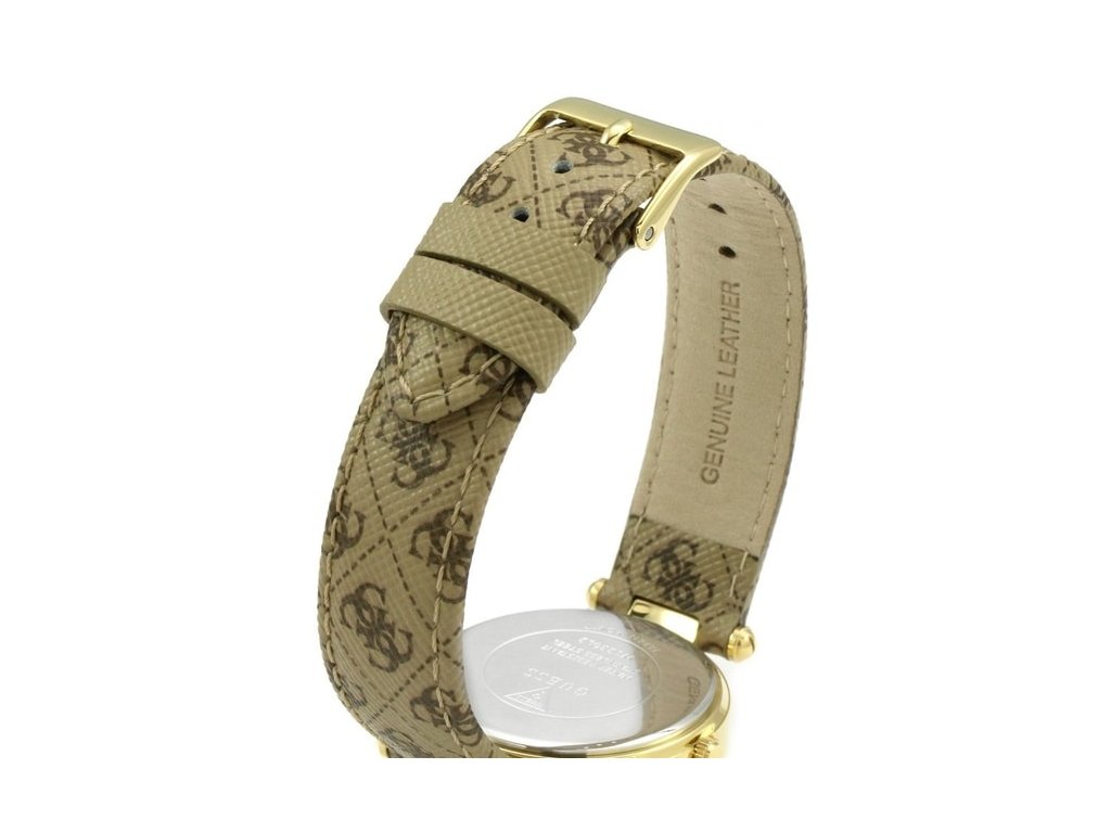 Dámské hodinky Guess W1230L2 s kožených řemínkem hnědé barvy. Na řemínku je znázorněn motiv písmene G, který je typický pro značku Guess.