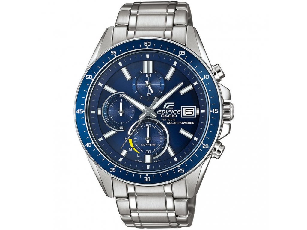 Solární pohon - pohon je zajištěn akumulátorem, který je dobíjen slunečním nebo umělým světlem, hodinky se dobíjejí při běžném nošení, není třeba měnit baterii.