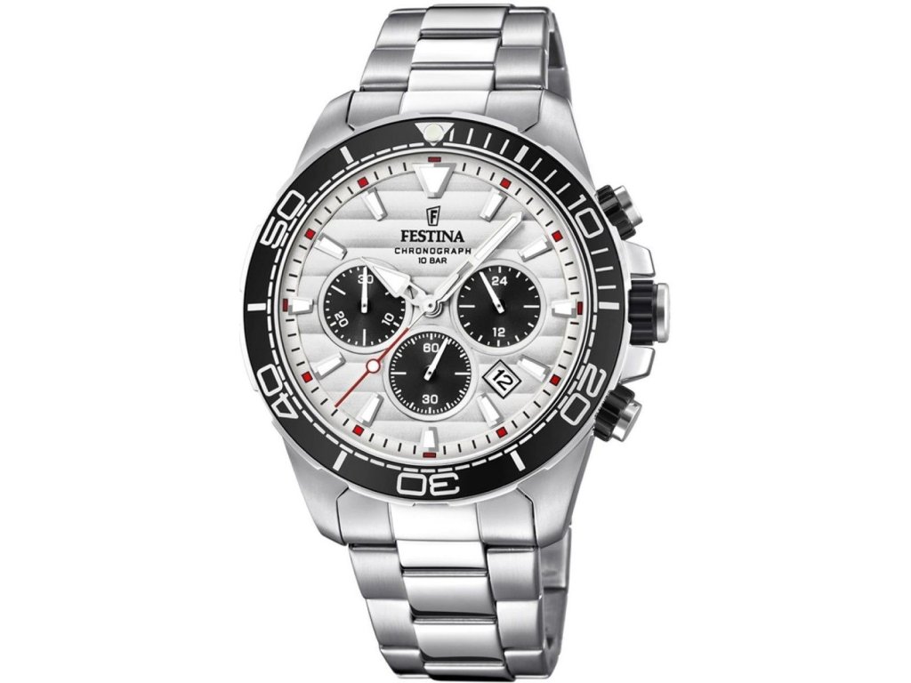 Pánské hodinky Festina 20361/1 ve sportovním stylu. Kovový řemínek, Vám upravíme na míru. Na displeji jsou zobrazeny tři chronografy. Datum je na pravé straně displeje. Vodotěsnost je 10ATM.