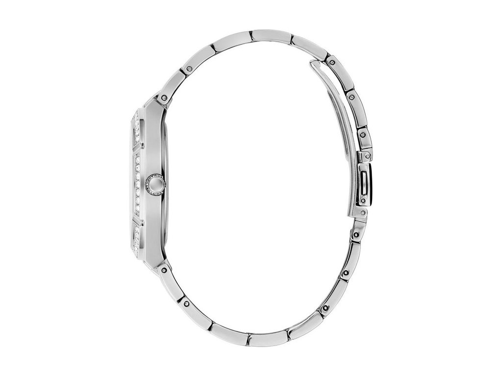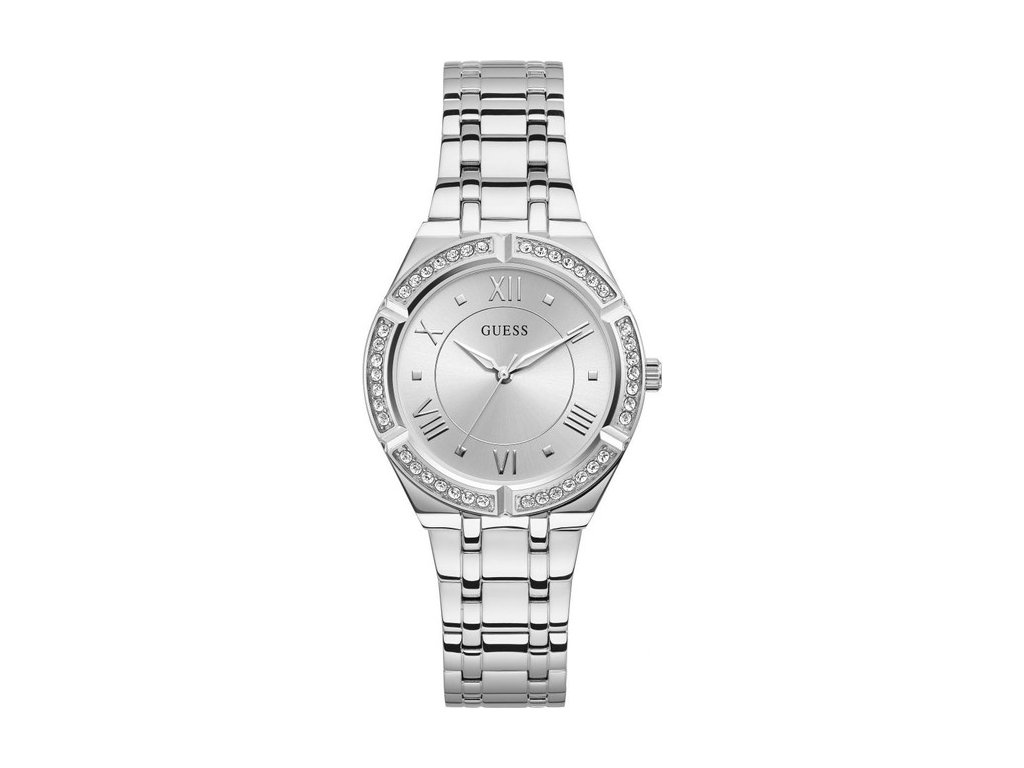 Dámské hodinky Guess GW0033L1 v moderním designu. Stříbrná barva řemínku, obruby i displeje. Na každé čtvrthodině je římská číslice.